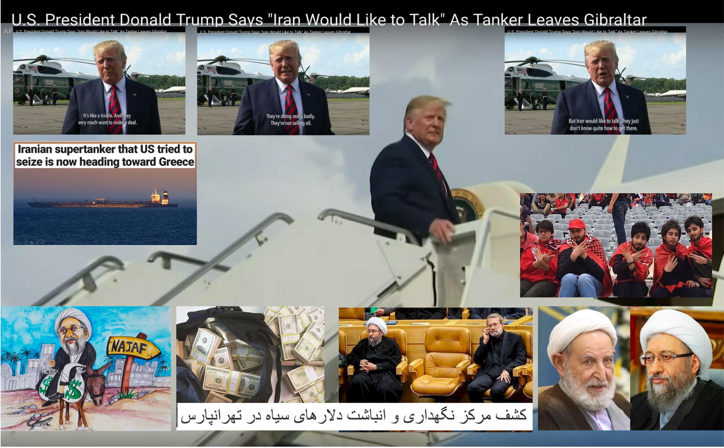 در کنار آن، ول شدن گریس وان مثل ماهی رهاشده از دستی که به چنگش داشت به سوی فعلا می گویند آبهای یونان، همزمان می شود با صحبت بسیار کوتاه ولی سراپا ترحم بار ترامپ شیردل بر پای پله های هواپیمایش با تاکید بر وضعیت رقت بار اقتصادی حکومت خمینیست و به علاوه این دفعه با کمی تاکید بیشتر از اشتیاق آقایان برای مذاکره خبر میدهد و اینکه گیر مانده اند و نمی دانند چگونه به باب صحبت و مذاکره برسند!…