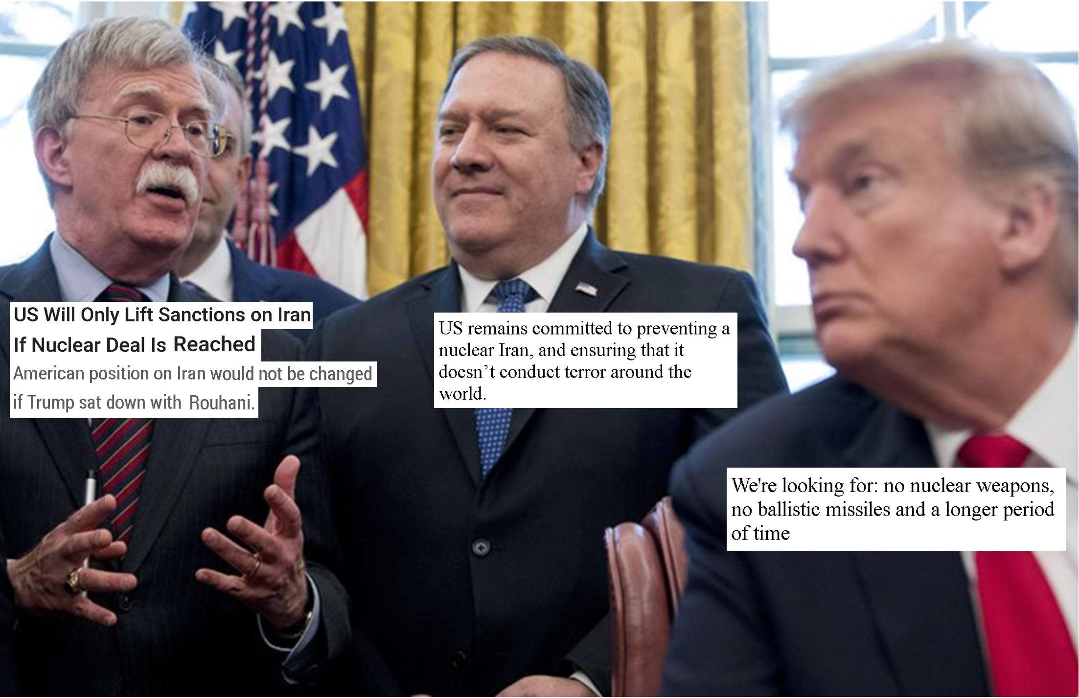 که البته در موافقت با آن هم پومپئو در حالی که سرش را به علامت تایید بالا و پایین تکان می داد و با آن غبغب پر ابهتش در نتیجه کلفت و نازک میشد، گفت بله آهان!، آمریکا به جلوگیری از اتمی شدن ایران متعهد باقی خواهد ماند. آمریکا میخواهد اطمینان حاصل کند که بزرگترین دولت حامی تروریسم در دنیا یعنی رژیم انقلابی ، در سراسر جهان شرر ترور نمیسوزاند، که داریم روی آن کار میکنیم، و هم نمی خواهیم که دارای سلاح اتمی باشند.