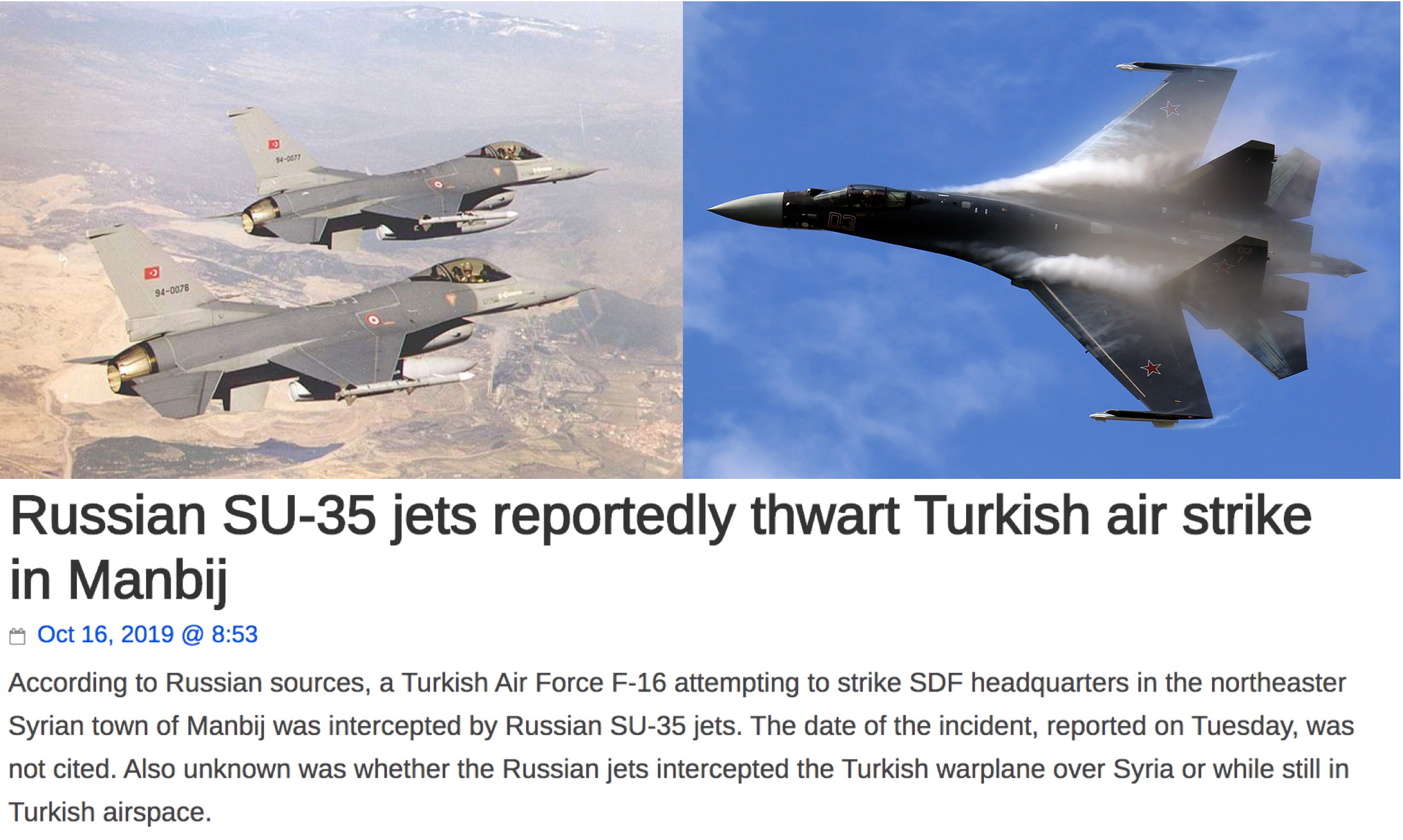 گفته میشود منابع روسی گزارش داده اند که امروز یک فروند اف-۱۶ نیروی هوایی ترکیه که عازم به سوی بمباران مقر فرماندهی نیروهای کرد در منبج بود توسط یک سوخو-۳۵ روسیه رهگیری شد و به اتمام ماموریتش نرسید. معلوم نیست که این رهگیری در حریم هوایی سوریه صورت گرفت یا در آسمان ترکیه.