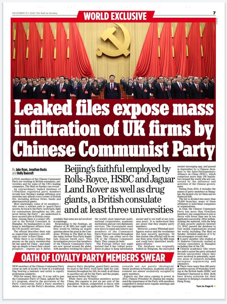 نسخهای از فهرست رسمی کاملی ازمشخصات مشروح و مبسوط ۱۹۵۰۰۰۰ عضو حزب کمونیست چین به بیرون درز کرده که نشان میدهد تکاتکشان در موسسه های گوناگون دول غربی، فَالبته در آمریکا استرالیا و انگلستان، صاحب های منصبند و دست اندرکار کارها در امور و چرخش آن تاسیسات و ادارات و غول شرکت ها.
