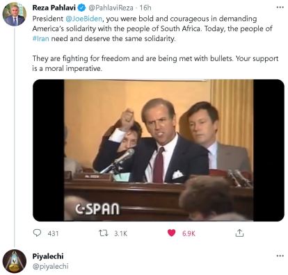 یکی از گلهای بزرگ تاریخ سیاست مدرن را امروز اعلیحضرت رضاشاه دوم ایران جانانه در دروازهی دولت جو بایدن کاشتند که در آن با استفاده از استراتژی و تکنولوژی، بایدن و دولتش را در رابطه با قیام خوزستان و کشتار مجدد مردم توسط نظام خونآشام در آچمز بینظیر اخلاقی قرار دادند.