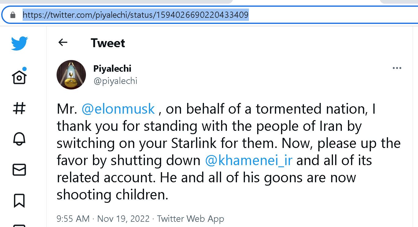 <**جناب آقای ایلان ماسک @elonmusk ، از جانب ملتی ستمدیده، ازتان متشکرم که با روشن کردن سوئیچ اینترنت ماهوارهایتان، استارلینک، برای پوشش دادن به ایران با مردمش ایستادید.