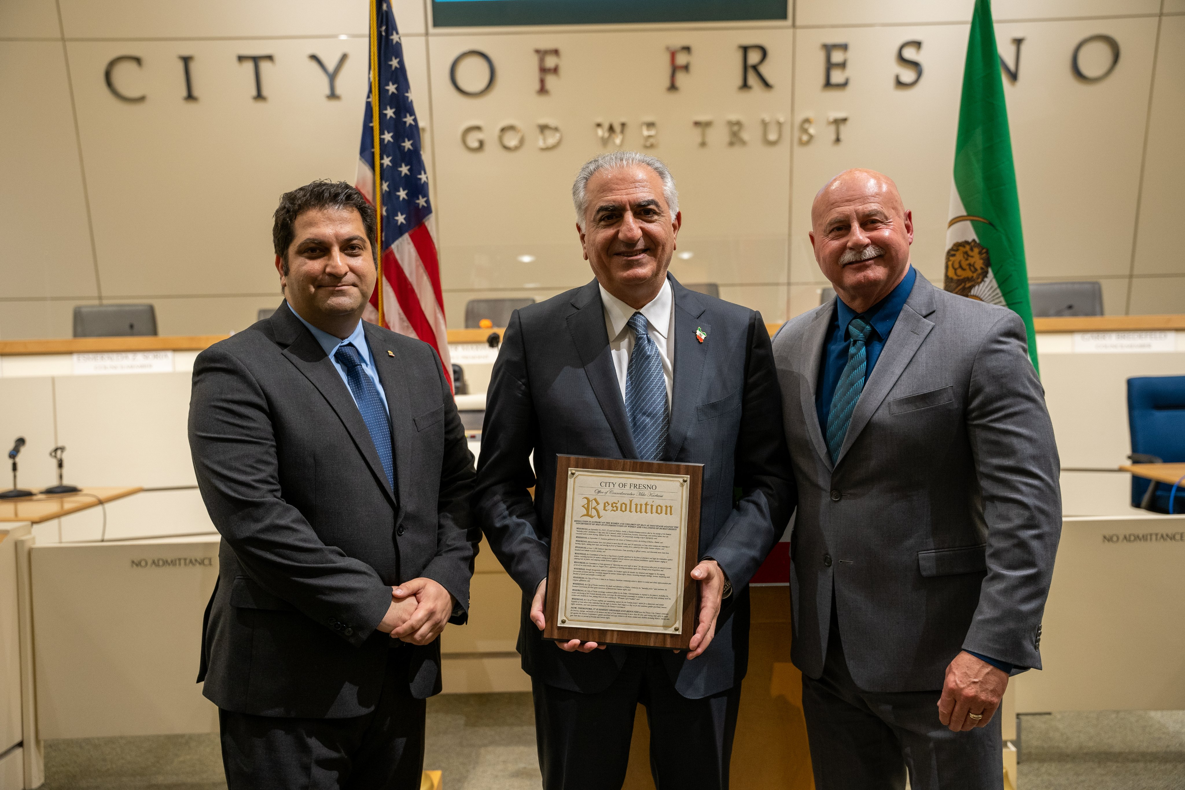 شهردار شهر فرسنوی ایالت کالیفرنیا، جری دایر، در مراسمی به مناسبت دیدار رضاشاه دوم ایران از شهرش مقدم اعلیحضرت را گرامی داشته و قطعنامه ای را نیز از سوی نهاد شهرداری به ایشان تقدیم کرد.