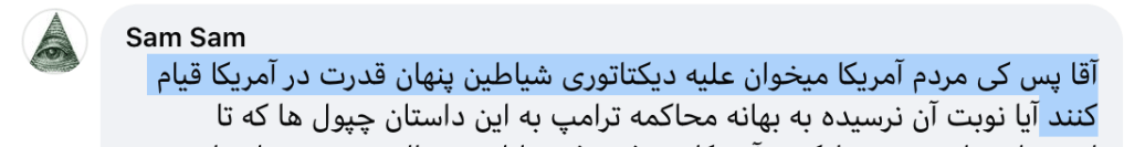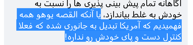 چون قاطبه باسواد و فهمیده شهروندان آمریکا، بی هیچ شبههای واقف به زجر ۴۴ سالهای که هموندان ایرانیشان کشیدهاند و دارند میکشند هستند، یحتمل منتظرند تا مردم ایران اول قیام کنن تا براشون الگوی دل قرصی بشن و ایشالا پیروز بشن تا اونا یاد بگیرن چجوری میشه هیولایی را به زانو و اطاعت، یا اگه اهلش هستین نابودی، درآورد که کلیت و اختیار نیروی هلاکتزا، محکم، در دستشه!… قیام علیه دیکتاتوری مخوف عایدیای جز آش و لاش شدن مگه داره؟…تا کی قراره مردم برن کشته بشن؟… مردم همه جا، مثل و قورباغه تو دیگ آب آرام آرام به جوش آمده، به مرگ تدریجی عادت کردهاند و ملامتشان هم نمیشه کرد …