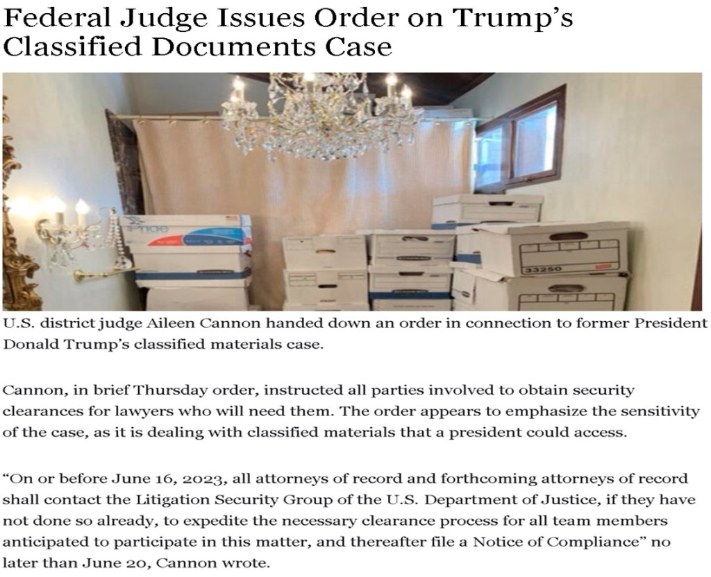 قاضی موظف کرد که هیشکی نمیتواند به چیزی دست بزند و هر کسی/وکیلی که لازم است/خواهد بود هر گونه تماسی با مدارک پرونده، که شامل اسناد و هر چه که حضرت در بارهشان طی محاکمه بگوید میشود، داشته باشد، باید برود و مجوز اطلاعاتی یا «سکیوریتی کلیرنس» لازم و مناسب را بگیرد!