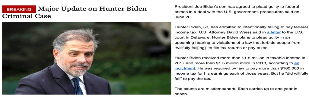دادستانان دست اندر کار پرونده جرایم هانتر بایدن اعلام کردند که پسر دردانه حاجی با آنان به توافق رسیده که به دو فقره جرم فدرال «عدم پرداخت عمدی مالیات بر درآمد» اعتراف بکند. یکی برای درآمد ۱/۵ میلیون دلاری سال ۲۰۱۷ و یکی دیگر ایضا برای همان مبلغ در سال ۲۰۱۸ . هانتر جان قصد دارد در جلسه آتی دادگاه که برای استماع جرائمش تشکیل خواهد شد به تخطی از قانونی که افراد را از «عدم ارائه عمدی اظهارنامه مالیاتی یا عدم پرداخت مالیات» منع میکند، رسما اعتراف کند. هر فقره از جرائم آقازاده که به عنوان جنحه محسوب میشوند، فوقش یک سال زندان را در بر میگیرند. لاکن ما میدانیم که پارتی آقازاده کلفت است و مجازاتش یه جوری هپلی هپو خواهد شد…