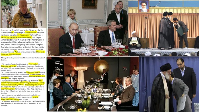 براستی دوستان، نوش… جنگ داخلی روسیه و خین خین ریزی در مسکو شاید فعلا منتفی شده باشد، لاکن هنوز خداحافظ پوتین است چرا که به گونهای میشود گفت که پریگوژین ورژن روسی همان بلای سیاسی را بر سر پوتین و بر وجهه مقتدرش آورد که مموتی بر اقتدار و وجهه ولایی عظما جیشید. این آخر ماجرا و گرفتاری هایی که از جهت پریگوژین به سوی پوتین خواهد آمد نیست و نخواهد بود. این شورش تازه اول سکانس خداحافظ پوتین پسا شورش واگنریست هاست.