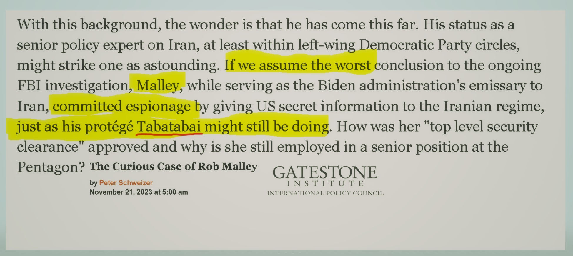 با این پیشینه، عجیب است که مالی تا اینجا پیش رفته است. وضعیت او به عنوان یک کارشناس ارشد در سیاست ایران، حداقل در محافل حزب دموکرات چپ، یحتمل شگفت انگیز به نظر میرسد. اگر بدترین نتیجه را از تحقیقات اف-بی-آی در حال انجام برای مالی فرض کنیم، او در حالی که به عنوان فرستاده و نماینده دولت بایدن در امور ایران خدمت می کرد، با دادن اطلاعات محرمانه ایالات متحده به رژیم ایران، مرتکب جاسوسی شده است، درست همان کاری که دست پرورده او، طباطبایی، ممکن است هنوز دارد انجام میدهد. آخر چگونه «مجوز امنیتی سطح عالی» او مورد تایید قرار گرفت و چرا او هنوز در یک موقعیت ارشد در پنتاگون در اشتغال است؟