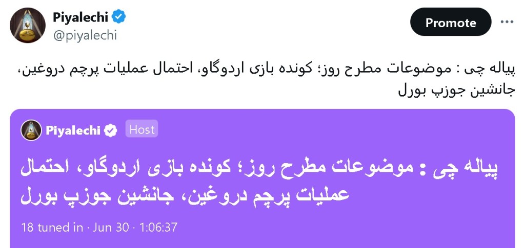اسپیس پیالهچی : موضوعات مطرح؛ کونده بازی اردوگاو، احتمال عملیات پرچم دروغین، جانشین جوزپ بورل بدست پیالهچی on 06/30/2024 • ( 0 ) پیاله چی : موضوعات مطرح روز؛ کونده بازی اردوگاو، احتمال عملیات پرچم دروغین، جانشین جوزپ بورل https://t.co/YHOwEKpiy2— Piyalechi (@piyalechi) July 1, 2024 بهاشتراکگذاری این: اشتراک گذاشتن توسط اس ام اس (در پنجرۀ تازه باز میشود) X برای اشتراکگذاشتن فیسبوک خود کلیک کنید (در پنجرۀ تازه باز میشود) فیسبوک برای اشتراکگذاری رو بالاترین کلیک کنید (در پنجرۀ تازه باز میشود) بالاترین ‹ اسپیس پیالهچی : موضوعات مطرح یکی دوتا …اسپیس پیالهچی : موضوعات مطرح؛ ترامپ و دیوان عالی و بقیه داستان ›دستهها:PodCast پیالهکَست, بازتاب ویژه مقالههای مرتبط عدهای میخواهند که ملا ها بمب را داشته باشند به نظر می آید بررسی آخرین برخورد نظامی اسرائیل با انگل های تروریست لبنان چگونه اسرائیل یک شبح را کشت – وال استریت ژورنال رژیم فقط یک گوزش مانده تا سرنگونی!