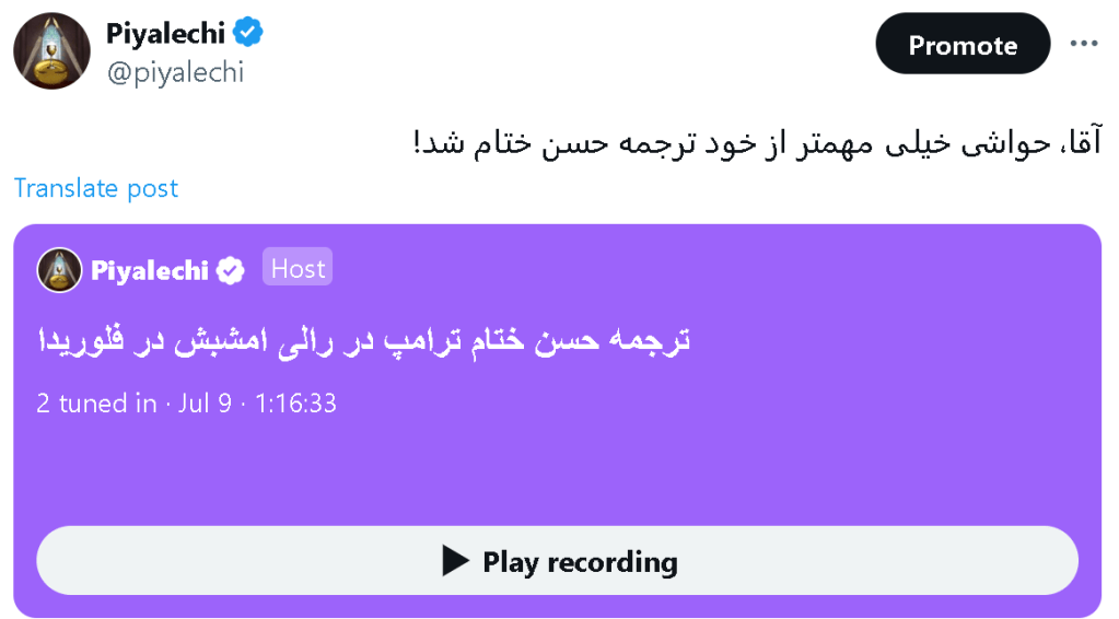 در حواشی رالی امشب ترامپ در فلوریدا بدست پیالهچی on 07/09/2024 • ( 0 ) بهاشتراکگذاری این: Share on X (در پنجرۀ تازه باز میشود) X به اشتراک گذاشتن در فیسبوک (در پنجرۀ تازه باز میشود) فیسبوک اشتراک گذاری در بالاترین (در پنجرۀ تازه باز میشود) بالاترین ‹ اسپیس پیالهچی: ساقی و هندلرهای حاجی حلال خورند والاه! روکمکنی هالیوودی از بقیه مدعی های نامزدی ریاست جمهوری حزب دموکراتامتناع بایدن از کناره گیری یعنی شکست او اتحاد سرخ و سیاه و آسانتر شدن کار شاه و ملت ایران ›دستهها:PodCast پیالهکَست, بازتاب ویژه مقالههای مرتبط عدهای میخواهند که ملا ها بمب را داشته باشند به نظر می آید بررسی آخرین برخورد نظامی اسرائیل با انگل های تروریست لبنان چگونه اسرائیل یک شبح را کشت – وال استریت ژورنال رژیم فقط یک گوزش مانده تا سرنگونی!