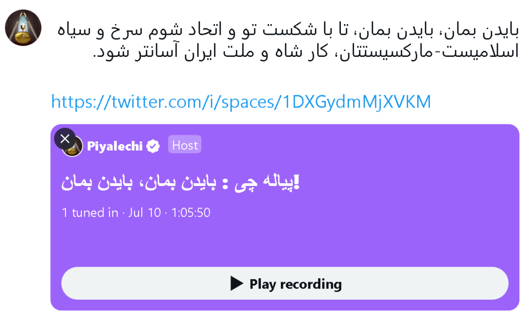 امتناع بایدن از کناره گیری یعنی شکست او اتحاد سرخ و سیاه و آسانتر شدن کار شاه و ملت ایران بدست پیالهچی on 07/10/2024 • ( 0 ) بهاشتراکگذاری این: اشتراک گذاشتن توسط اس ام اس (در پنجرۀ تازه باز میشود) X برای اشتراکگذاشتن فیسبوک خود کلیک کنید (در پنجرۀ تازه باز میشود) فیسبوک برای اشتراکگذاری رو بالاترین کلیک کنید (در پنجرۀ تازه باز میشود) بالاترین ‹ در حواشی رالی امشب ترامپ در فلوریداراینو های مادر #@٪×! ›دستهها:نوش نگارش مقالههای مرتبط حمله نظامی آمریکا به تاسیسات هستهای جمهوری اسلامی در تله آتش بس نیفتیم – امیر طاهری چراغ سبز بیبی به مردم ستمدیده ایران حرکت نظامی تاریخی امروز اوکراین و شاید ربطش به ما و کشور دوستمان اسرائیل، و البته به کبودی چشم ایلان ماسک