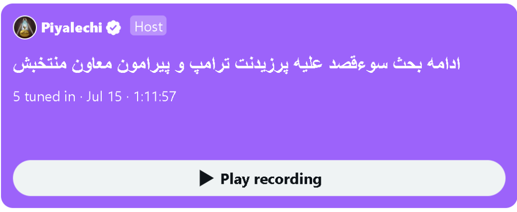 شهید زنده و معاون منتخبش، مخلفات… بدست پیالهچی on 07/15/2024 • ( 0 ) ادامه بحث سوءقصد علیه پرزیدنت ترامپ و پیرامون معاون منتخبش و غیره… بهاشتراکگذاری این: اشتراک گذاشتن توسط اس ام اس (در پنجرۀ تازه باز میشود) X برای اشتراکگذاشتن فیسبوک خود کلیک کنید (در پنجرۀ تازه باز میشود) فیسبوک برای اشتراکگذاری رو بالاترین کلیک کنید (در پنجرۀ تازه باز میشود) بالاترین ‹ سوء قصد ناموفق علیه ترامپ و غیره..در امتداد حکایت شهید زنده و حاج یوسف مبتلا به کووید ›دستهها:PodCast پیالهکَست, بازتاب ویژه مقالههای مرتبط عدهای میخواهند که ملا ها بمب را داشته باشند به نظر می آید بررسی آخرین برخورد نظامی اسرائیل با انگل های تروریست لبنان چگونه اسرائیل یک شبح را کشت – وال استریت ژورنال رژیم فقط یک گوزش مانده تا سرنگونی!