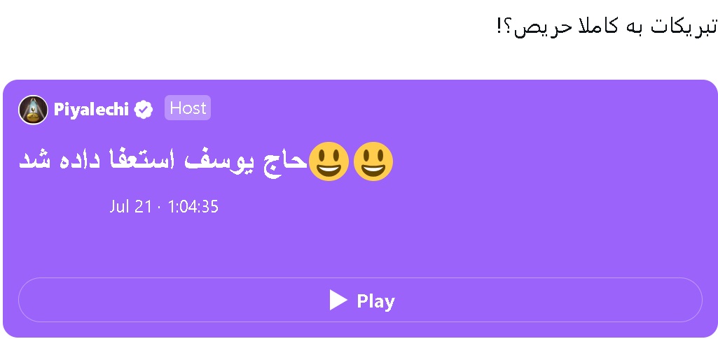 حاج یوسف استعفا داده شد! بدست پیالهچی on 07/21/2024 • ( 0 ) https://twitter.com/i/spaces/1zqJVYyQPoaGB بهاشتراکگذاری این: اشتراک گذاشتن توسط اس ام اس (در پنجرۀ تازه باز میشود) X برای اشتراکگذاشتن فیسبوک خود کلیک کنید (در پنجرۀ تازه باز میشود) فیسبوک برای اشتراکگذاری رو بالاترین کلیک کنید (در پنجرۀ تازه باز میشود) بالاترین ‹ در امتداد حکایت شهید زنده و حاج یوسف مبتلا به کوویدجر دادن کیمبرلی چیتل در کنگره، حاج یوسف هم آسمانی شد؟! ›دستهها:نوش نگارش مقالههای مرتبط حمله نظامی آمریکا به تاسیسات هستهای جمهوری اسلامی در تله آتش بس نیفتیم – امیر طاهری چراغ سبز بیبی به مردم ستمدیده ایران حرکت نظامی تاریخی امروز اوکراین و شاید ربطش به ما و کشور دوستمان اسرائیل، و البته به کبودی چشم ایلان ماسک